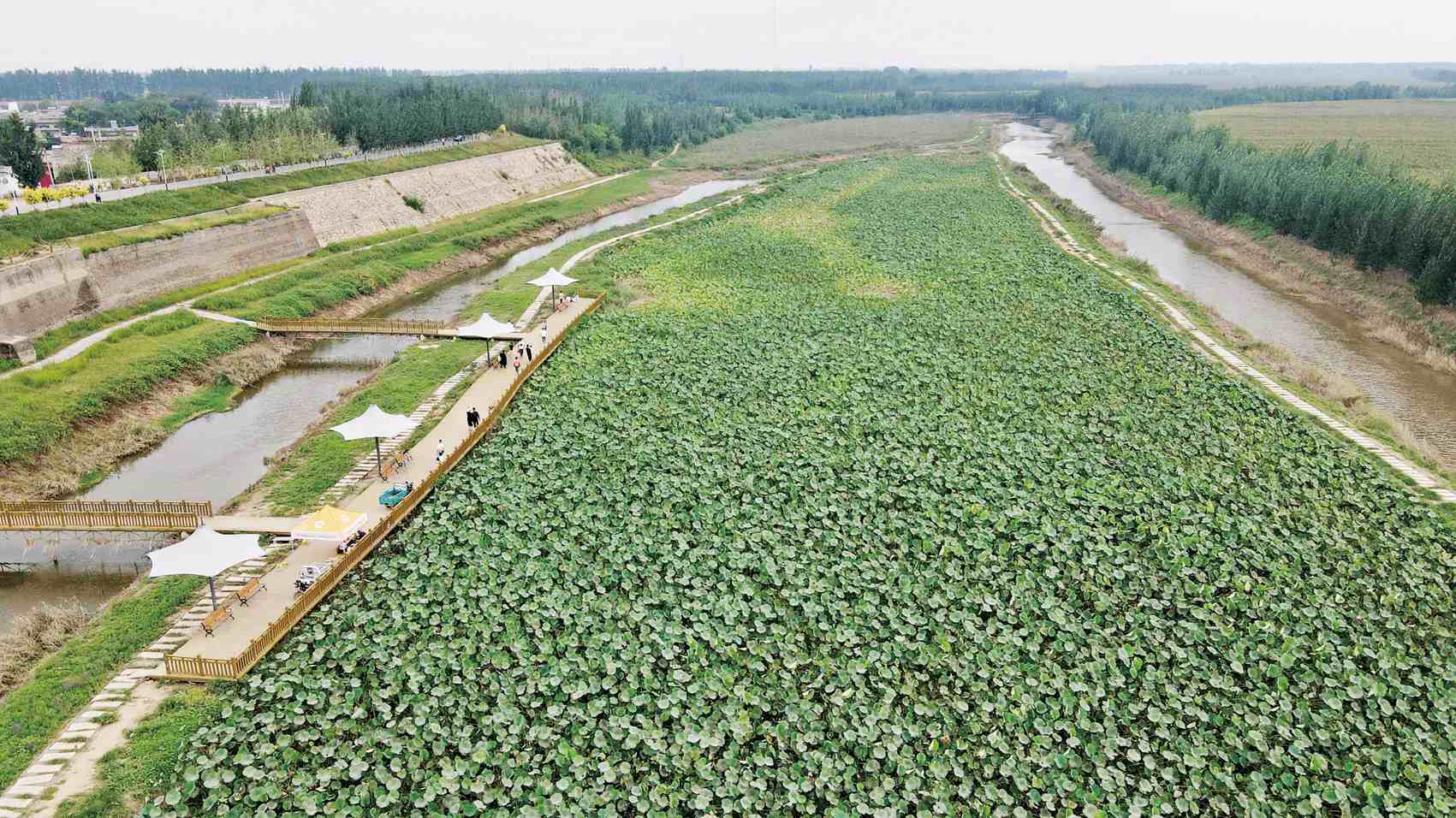 ▲ 河北省清河县油坊镇大运河畔的荷塘景观(无人机照片) 新华社记者 牟 宇 摄