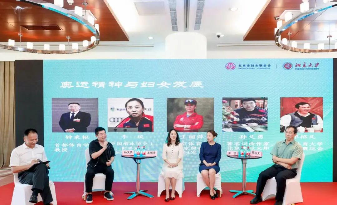 圆桌对话围绕“奥运精神与妇女发展”展开,首都体育学院教授钟秉枢担任主持人,对话中国滑冰协会主席、世界冠军、奥运冠军教练李琰,北京体育大学国家级教练、奥运冠军王丽萍,北京体育大学教授、奥运会裁判邱招义与著名词曲作家、北京奥运火炬手孙义勇。