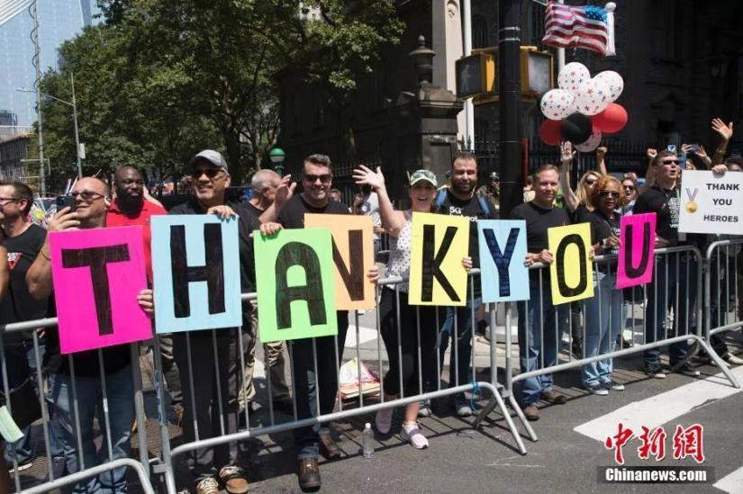 资料图: 当地时间7月7日,纽约观看游行的民众向抗疫工作者打出“感谢”标语。