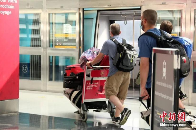 资料图:当地时间7月5日,加拿大多伦多皮尔逊国际机场,旅客准备搭乘机场轻轨列车。