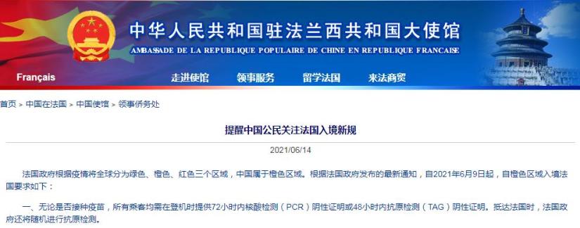 6月14日,中国驻法国大使馆网站发布提醒中国公民关注法国入境新规的通知,以下为使馆提醒: