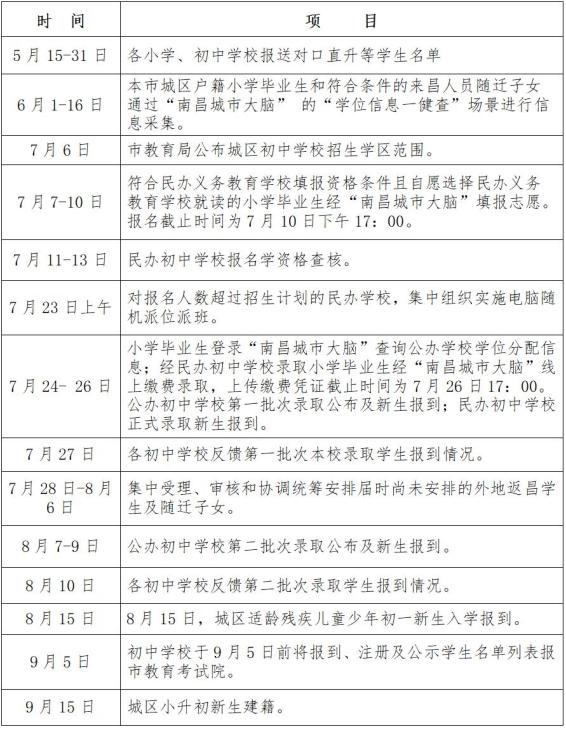 南昌市2021年城区小学升初中免试就近入学招生录取日程安排