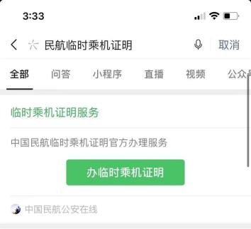 打开微信,在页面顶端搜索框输入“民航临时乘机证明”,或直接扫描机场张贴的二维码即可办理;
