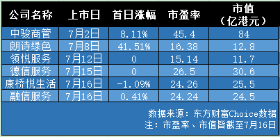7月16日,融信服务与康桥悦生活同时挂牌上市,二者双双开盘即破发。截至收盘,融信服务微涨0.41%,康桥悦生活的跌幅则缩小至1.09%。而7月2日上市的中骏商管首日股价涨幅为8.11%,朗诗绿色涨幅达41.51%,领悦服务、德信服务则皆以发行价收盘。