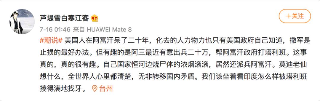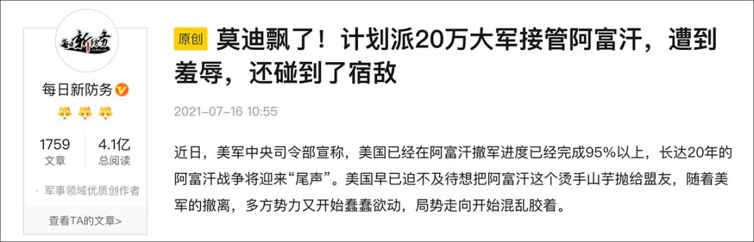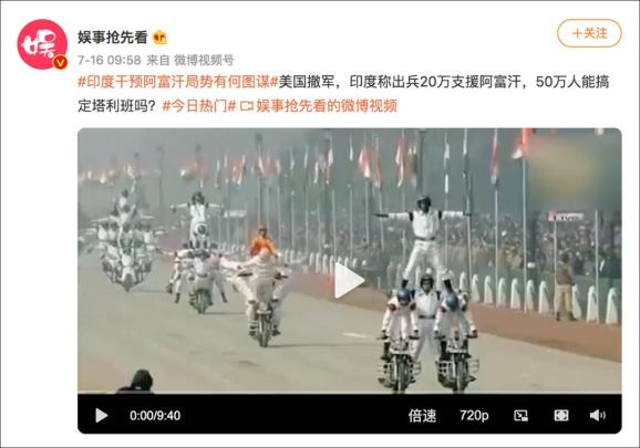 微博、搜狐等平台上大量流传印度欲武装介入阿富汗局势,准备出兵20万进入阿富汗打击塔利班的消息。