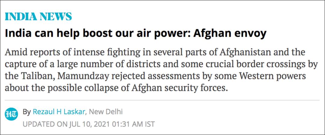 《印度斯坦时报》也在7月10日报道,马蒙扎伊排除了寻求印度向阿富汗派兵的可能性,但表示印度可以在军事装备、情报、后勤支持以及财政方面协助喀布尔。