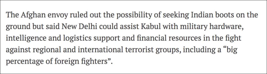没有证据显示印度决定向阿富汗派遣军队。阿富汗驻印度大使也排除了寻求印度向阿富汗派遣军队的可能性。