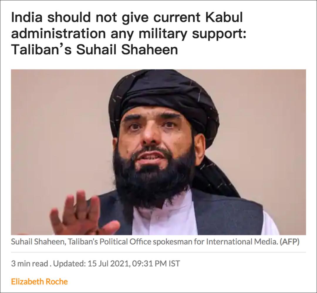 7月15日,塔利班卡塔尔办公室发言人沙欣对印度媒体Mint说:“印度应该保持中立,不应该用军事装备支持目前的喀布尔政府,因为这些装备最终会被用来对付阿富汗人民和破坏国家。这对他们的形象和阿富汗人民对他们的看法是不利的。”