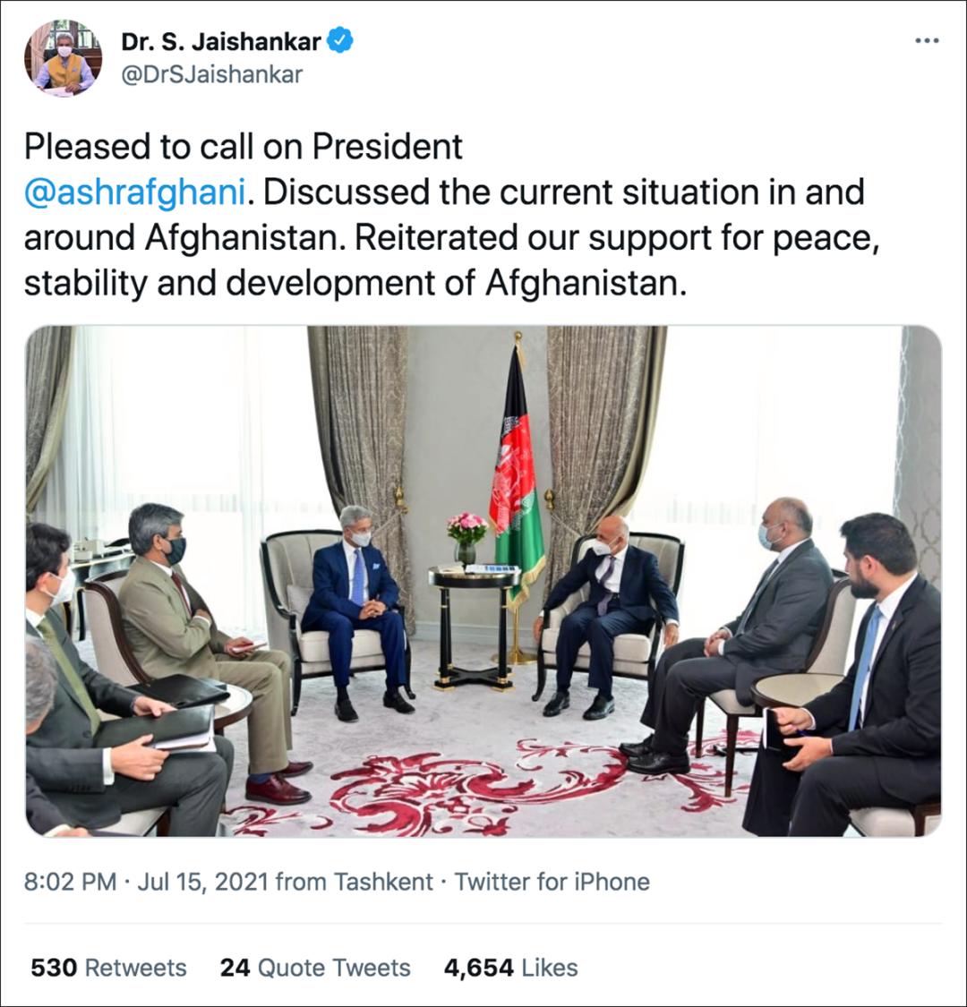 同一天,印度外长苏杰生在乌兹别克斯坦首都塔什干会见了阿富汗总统加尼。苏杰生在推文中称:“很高兴拜会加尼总统,讨论阿富汗境内和周边地区的当前局势,重申我们对阿富汗和平、稳定和发展的支持。”