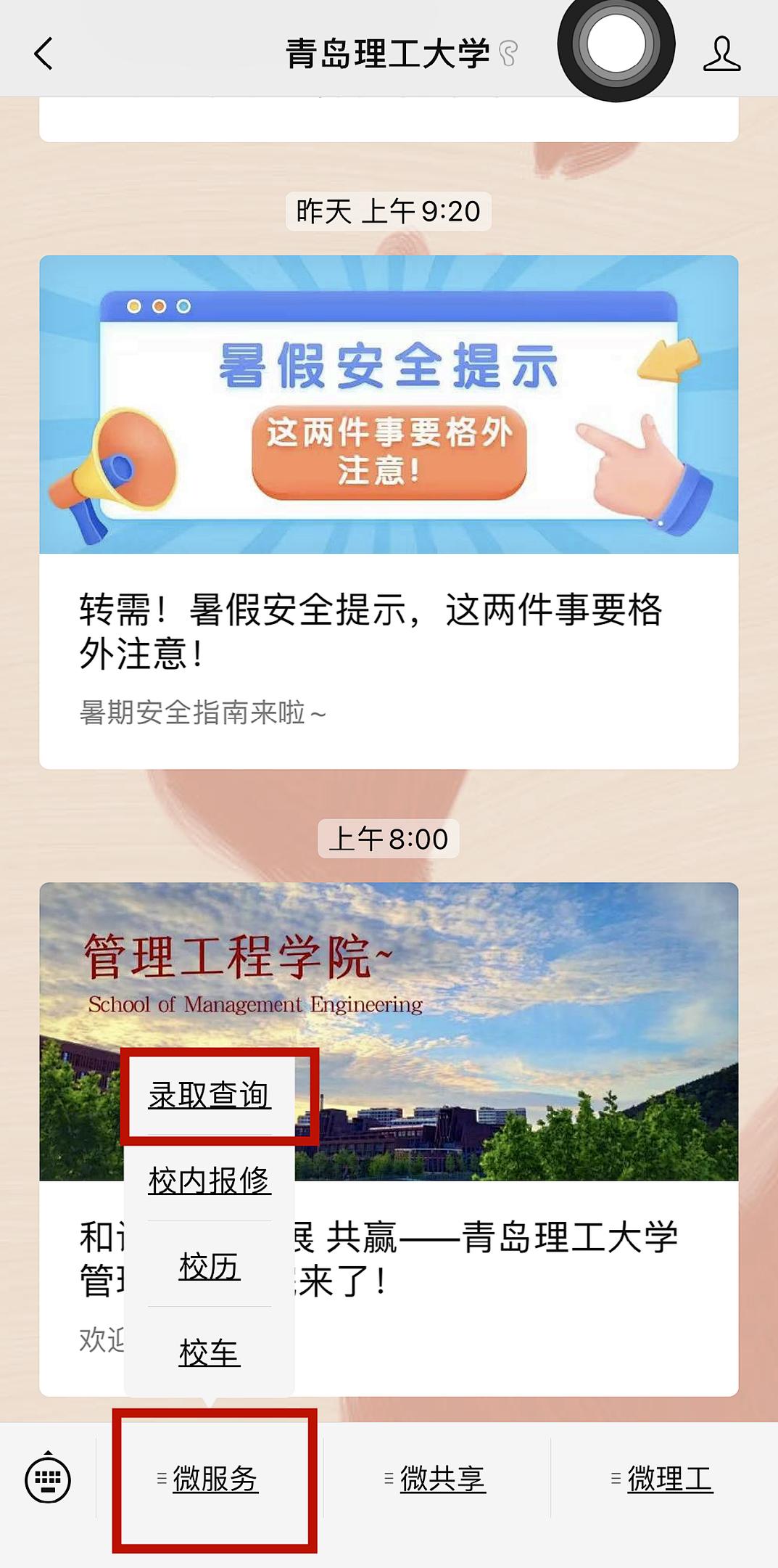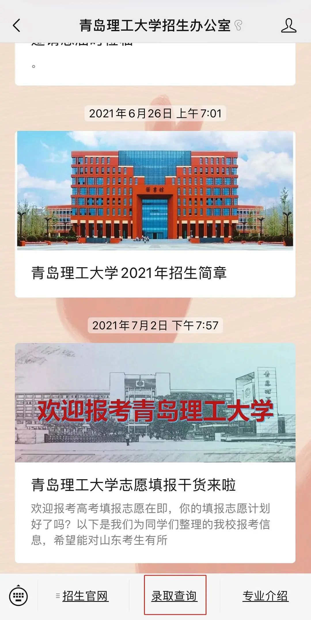2、在公众号页面下方点击栏目“录取查询”,在查询页面输入14位考生号和姓名即可查询录取结果。