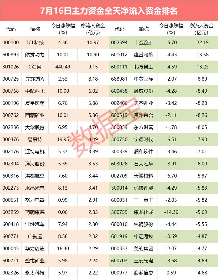 主力资金净流出个股中,比亚迪主力资金净流出22.19亿元,连续三个交易日主力净流出资金最多;其次是隆基股份、北方稀土,净流出资金分别为13.58亿元、13.23亿元。