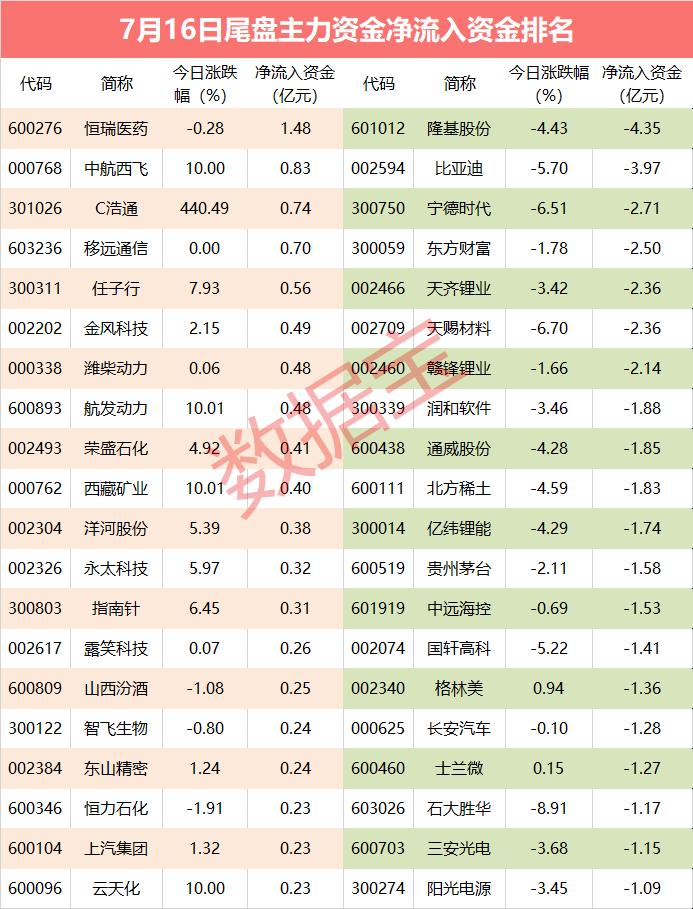 从个股尾盘资金流向数据看,有13股尾盘净流入资金超过3000万元,恒瑞医药、中航西飞、C浩通等个股尾盘资金净流入金额最多,分别达1.48亿元、8261.97万元、7419.75万元;隆基股份、比亚迪、宁德时代等个股尾盘资金净流出金额居前,分别流出4.35亿元、3.97亿元、2.71亿元。