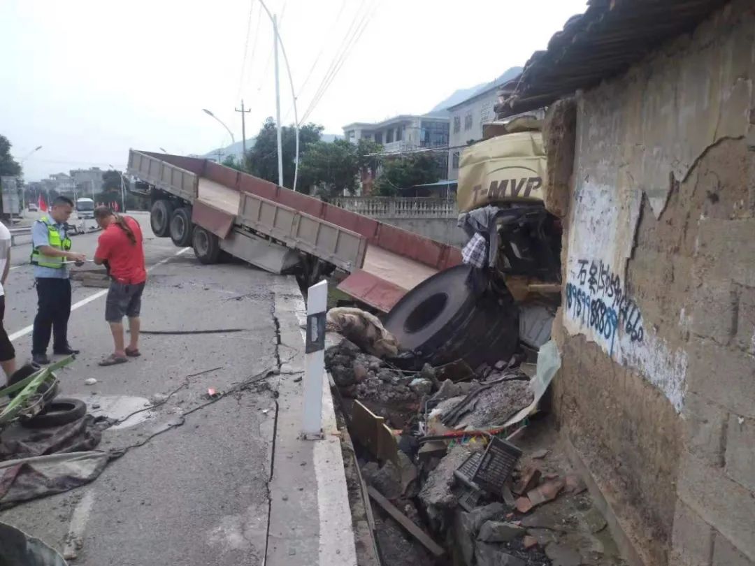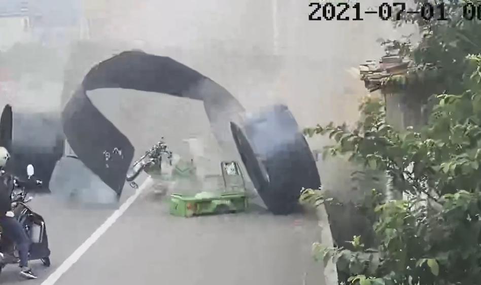 2021年7月1日06时31分,一辆半挂牵引车沿324国道由莆田市区方向往仙游方向行驶,司机因犯困打盹,导致车辆冲过中央护栏发生侧翻,车上运载的冷轧钢板滚落,砸向对向车道的三轮车,薄薄的钢板从三轮车驾驶员头上飞过,三轮车被砸得解体,路边房屋被砸倒。