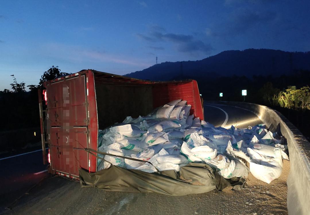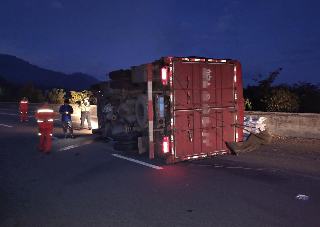 7月13日凌晨3时,南平高速交警四大队民警接到报警称:“一辆货车侧翻在主车道上,现场无人员伤亡,民警接警后立即赶赴现场,并开展临时管制。