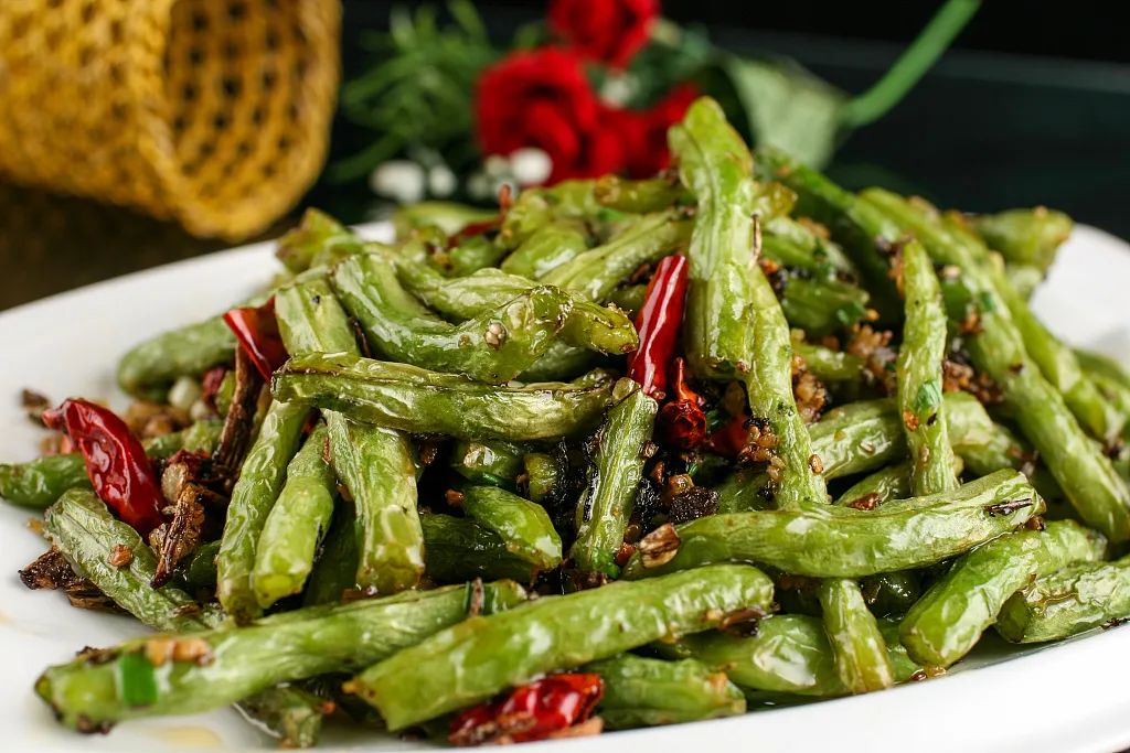 干煸豆角也是超能吸油的一道菜,做这道菜需用油将豆角皮炸至呈“虎皮”状。除热量超标、损失了B族维生素、维生素C等营养成分外,还有可能带来安全风险。因为油炸时,豆角可能外焦里生,没有彻底做熟,其中含有的氰苷没能在高温烹煮时挥发出来,可能导致食物中毒。