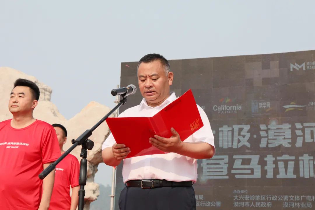 行署副专员孙亮在致辞中说,近年来,大兴安岭地委、行署将“全民健身+全域旅游”深度融合,依托漠河旅游核心竞争优势,大力发展“体育+旅游”模式,“冰雪”“极昼”系列马拉松等精品赛事活动已成为提升旅游内涵和文化底蕴的重要渠道,展现民族风情和旅游资源的重要平台,有力推动了大兴安岭旅游业的快速发展。这次赛事必将成为全区体育事业和文旅产业联动发展的重要纽带,成为扩大开放、增进友谊、促进交流的“金色名片”。