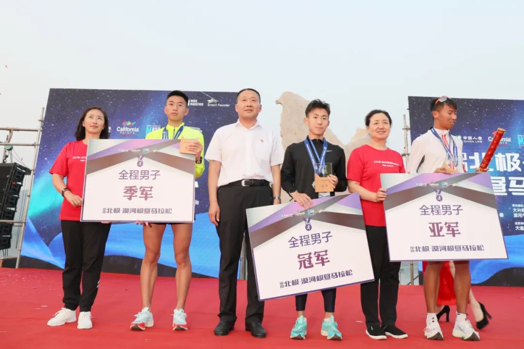 漠河市委书记吴庆军、新华网黑龙江分公司总经理袁英、漠河市副市长叶琳分别为男子全程冠亚季军颁奖。