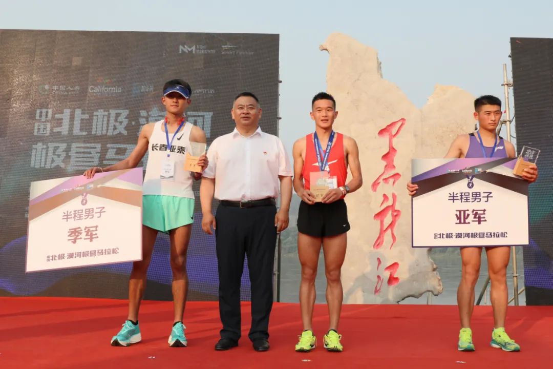 漠河市委副书记、代市长邢雪松为男子半程冠亚季军颁奖。