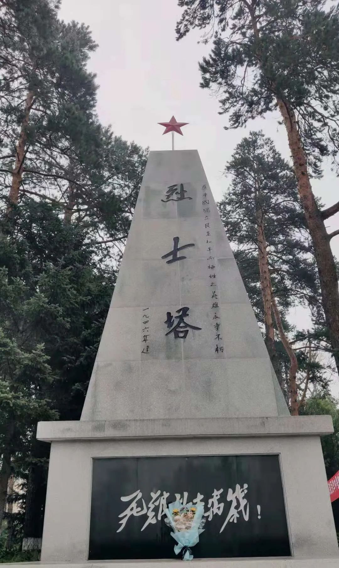 重建的王肃烈士殉难纪念碑更加壮观,也更加庄严肃穆。进入纪念碑之前的开阔地,是用预制块铺就宽敞的广场和平坦的人行步道,四周有汉白玉桩连接两道铁链形成的围栏,远处有白桦林,纪念碑的左手边植有三株樟子松,其中一株枝繁叶茂,挺拔俊逸。松树常青,象征烈士精神永存。整个纪念碑的基础底座大约五六平方米,有五级台阶,是混凝土结构。四周的围栏也是汉白玉材质,上面刻有图案。纪念碑为汉白玉材质,有两三米高,由两部分组成,一部分是碑底座,上面镶嵌着黑色大理石,石上刻有横排的“1946年6月12日”,是王肃烈士壮烈牺牲的日期;另一部分是碑体,是一个壮观的长方形,碑体正面镶嵌黑色大理石,刻有竖排的“王肃烈士殉难地”七个鎏金大字,异常醒目,望之,让人不由心生追思之情。我前后左右、认认真真地瞻仰了纪念碑,还观看了文字介绍石碑,石牌也是黑色大理石材质,正面介绍王肃烈士殉难经过,背面简述了王肃烈士生平。带着崇敬的心情,缅怀王肃烈士……