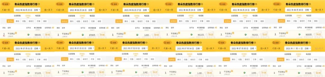 与之相应的是明显上升的口碑和热度。自上古转生成后池“那日”起,《千古玦尘》的热度便一直稳居骨朵网络剧热度榜榜首,甚至有几日突破80,正式迈入了匹配S+大剧“身份”的热度行列。