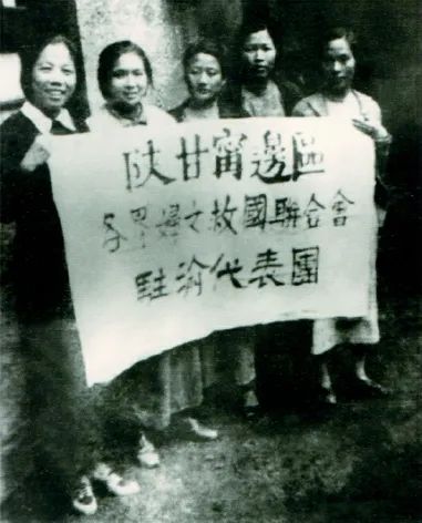 1938年3月8日,陕甘宁边区各界妇女联合会在延安成立。图为驻渝代表团合影。左起:邓颖超、卢竞如、张晓梅、廖似光、张玉琴。