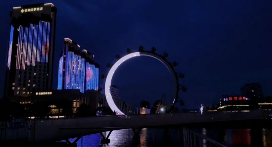 整个摩天轮是无轴的,内外侧还装了光源,星星点点,夜间好似繁星密布。
