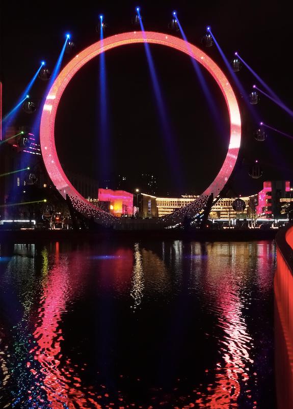 夜晚经常有灯光秀,摩天轮和背后大楼闪耀着的灯光,映射在湖面很好看。