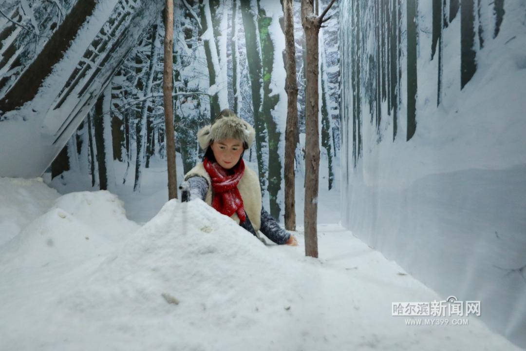 陈列馆二楼,还原了赵一曼持枪战斗的场景。大雪及腰,赵一曼的脸冻得通红,林海雪原中,她目光坚毅,不惜献出血肉之躯,誓要实现民族解放的理想。