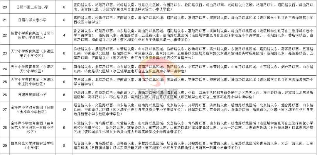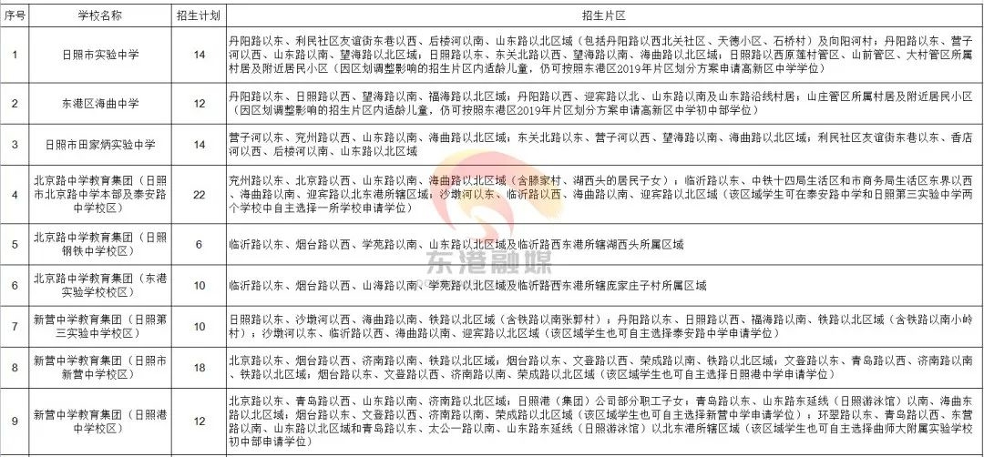 对济南路小学、东港实验学校、实验三中等个别学校的招生片区进行了调整,房产地址为多校划片区域的,家长可根据自己的意愿在划片指定的多校中自主选择一所学校报名申请学位。