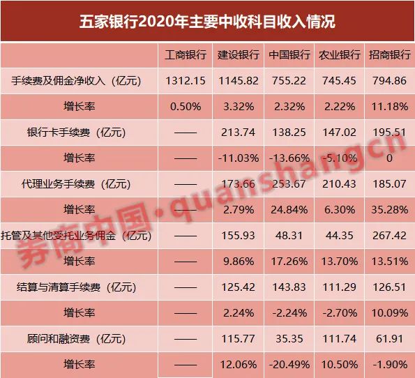 落后的在落后,居前列的维系得也不轻松。工行2020年手续费及佣金净收入为1312亿元,对比2019年的1306亿元增幅几乎可以忽略不计;建行表现已是大行最佳,当年手续费及佣金净收入1145.82亿元,较上年增长3.32%,但仍与招行的增长率11.18%已不在一个量级。