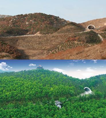 华夏集团采用修复与提升相结合的生态治理模式,根据山体受损情况,以达到最佳生态恢复效果为原则,分类开展受损山体综合治理和矿坑生态修复。一是土方回填,修复山体。根据威海缺水的气候特征和矿坑断面高的情况,采用难度大、成本高但效果最佳的拉土回填方式修复山体。二是修建隧道,改善交通。对被双面开采,破损极其严重难以修复的山体,经充分论证后,规划建设隧道,隧道上方覆土绿化、恢复植被,下面方便通行。三是拦堤筑坝,储蓄水源。为了解决缺水难题,在开采最为严重的矿坑密集区,利用山势,采用黄泥包底的原始工艺,修筑了大小塘坝35个,经天然蓄水、自然渗漏后形成水系,为部分景点和植被灌溉提供了水源,改善了局部生态环境。四是栽植树木,恢复生态。在填土治理矿坑的同时进行绿化,因地制宜地栽植雪松、黑松、刺槐、柳树等各类树木200余种,恢复绿水青山、四季有绿的生态原貌。经过“愚公移山”“凤凰涅槃”式的努力,最终将寸草不生的渣石矿坑恢复了生态,变成了山水林田湖草相得益彰、相映成趣的旅游景区。