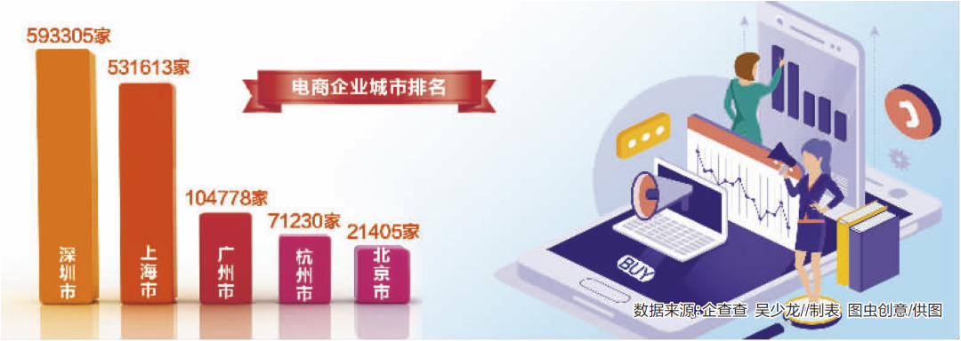 企查查数据显示,截至今年6月末,深圳电商企业数量已达59.33万家,居全国首位,上海、广州分别为53.16万家和10.48万家,分列二三位。若从注册资本看,深圳注册资本达1000万元以上的电商企业占比仅9%,远低于北京的24%,同样不及杭州、上海和广州。