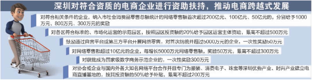 近日,深圳市商务局发布《关于推动电子商务加快发展的若干措施》,对符合资质的电商企业进行资助扶持,以期推动深圳电商跨越式发展。细则从加速培育本地法人电商平台、加大力度引进大型电商平台、加速建设一批电商产业集聚园区等多方面提出针对性措施,明确各项政策措施的适用对象、申请条件、资金安排、支持标准等,力度大、措施针对性强,一下子吸引了市场的高度关注。