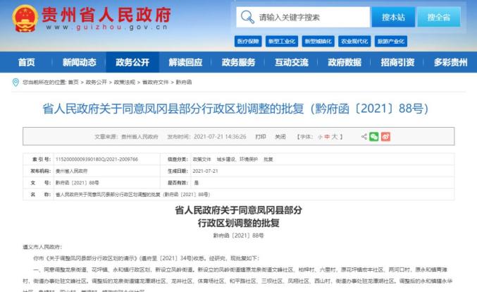 经研究,近日,贵州省人民政府对遵义市政府《关于调整凤冈县部分行政区划的请示》作出批复,主要内容如下: