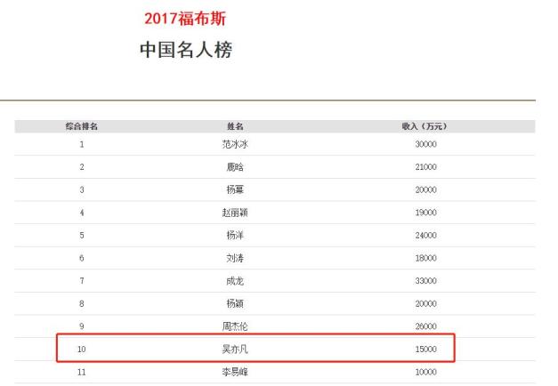 2017福布斯中国名人榜显示,当年吴亦凡的年收入达1.5亿,排在榜单的第十位。2020福布斯中国名人榜,吴亦凡更进一步,排到了榜单的第8位,不过2020年的榜单并没有透露名人的收入情况。