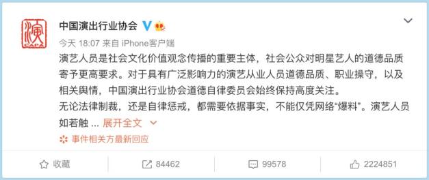 7月19日晚,@中国演出行业协会发文称,演艺人员是社会文化价值观念传播的重要主体,社会公众对明星艺人的道德品质寄予更高要求。对于具有广泛影响力的演艺从业人员道德品质、职业操守,以及相关舆情,中国演出行业协会道德自律委员会始终保持高度关注。