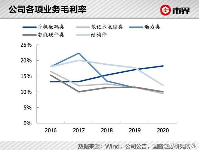 2020年年报显示,其手机数码类毛利率18.24%,智能硬件类更低,仅10%,整体上来看欣旺达毛利不到15%。相比之下,同行业的亿纬锂能和宁德时代毛利率均超过25%。