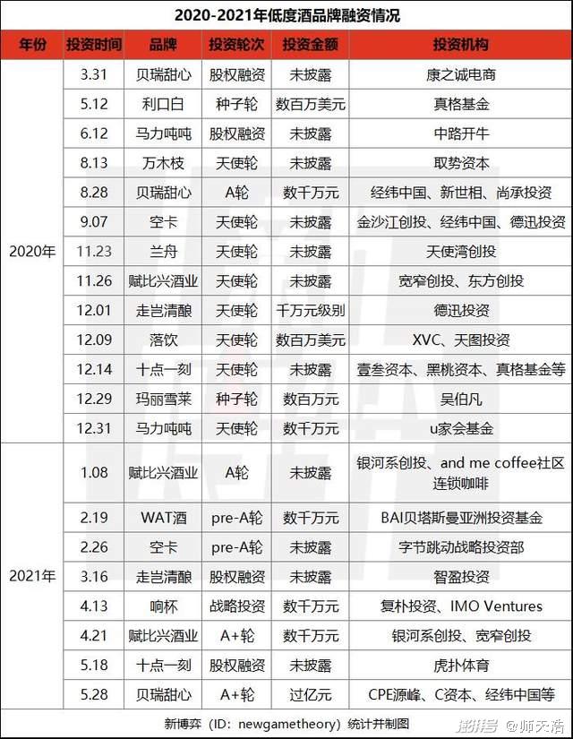 势力盘踞的低度酒赛道,自然也引来资本的关注。据新博弈不完全统计,在2016年至今已经有23家低度酒品牌获得了总计30次以上的融资,其中21次发生在2020年以后。直到2020年末,低度酒行业总融资规模高达近10亿元。而根据猎云网统计,2020年至今,贝瑞甜心、兰舟、马力吨吨等超过10家低度酒品牌获得融资,投资机构中不乏有经纬中国、真格基金等知名机构。从融资的次数、规模、投资机构,都不难看出"微醺市场"在持续升温。