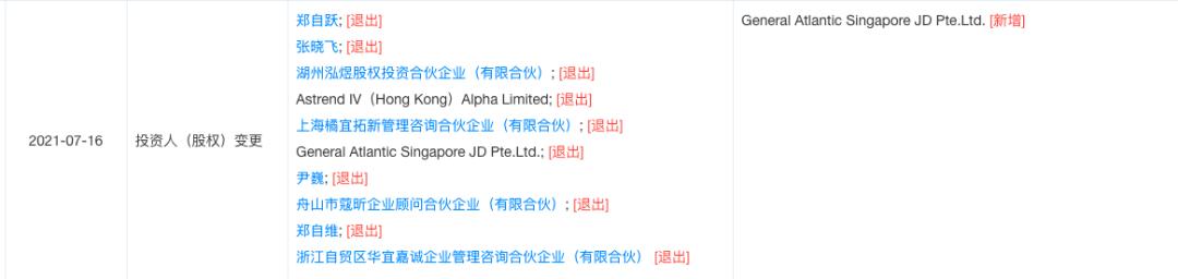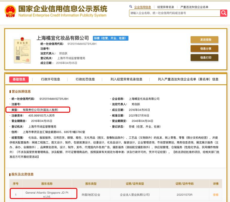 7月16日,天眼查APP显示,橘朵母公司上海橘宜化妆品有限公司(以下简称“上海橘宜”)发生工商变更,包括创始人郑自跃在内的9名股东已全部退出,上海橘宜已经由General Atlantic Singapore JD Pte.Ltd.(泛大西洋资本)100%控股。