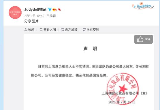 随后,橘朵官方微博紧急发布声明称:“目前网上信息为相关人士不实猜测。创始人团队仍旧是公司最大股东,并长期控制公司。公司经营健康稳定。橘朵依然是国货品牌。”