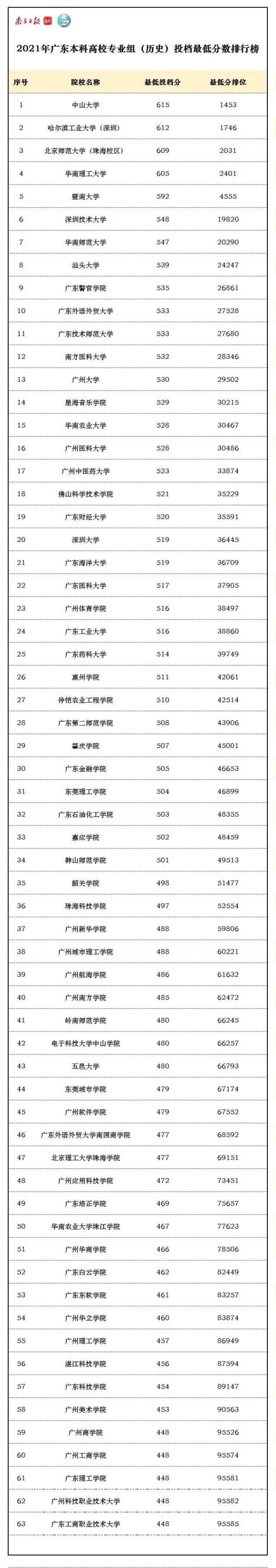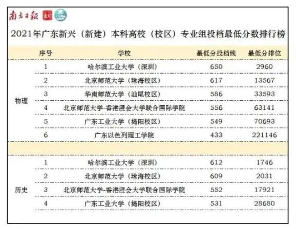 在历史类中,哈尔滨工业大学(深圳)同样拔得头筹,以612分、1746位,接近华中科技大学在广东录取的情况。北京师范大学(珠海校区)609分、2031位紧跟其后,北京师范大学-香港浸会大学联合国际学院552分、17921位位居前列,广东工业大学(揭阳校区)首年招生取得531分、28680位的成绩。