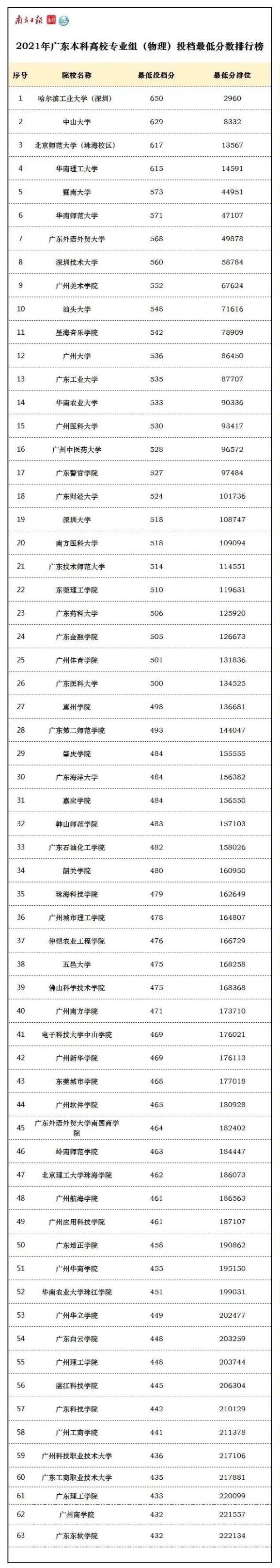 从物理类方面看,哈尔滨工业大学(深圳)专业组中最低投档线为650分,最低排位为2960位,这一“战绩”接近上海财经大学在广东招生的最低排位,吸引一批高分考生。北京师范大学(珠海校区)以617分、13567位的成绩也备受关注,更多广东学子实现在省内就读北师大的愿望。