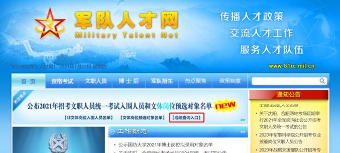 2021年7月22日14时至8月4日18时,在军队人才网开通考试成绩查询服务,考生可通过首页“成绩查询入口”,凭用户名和密码查询本人考试成绩。
