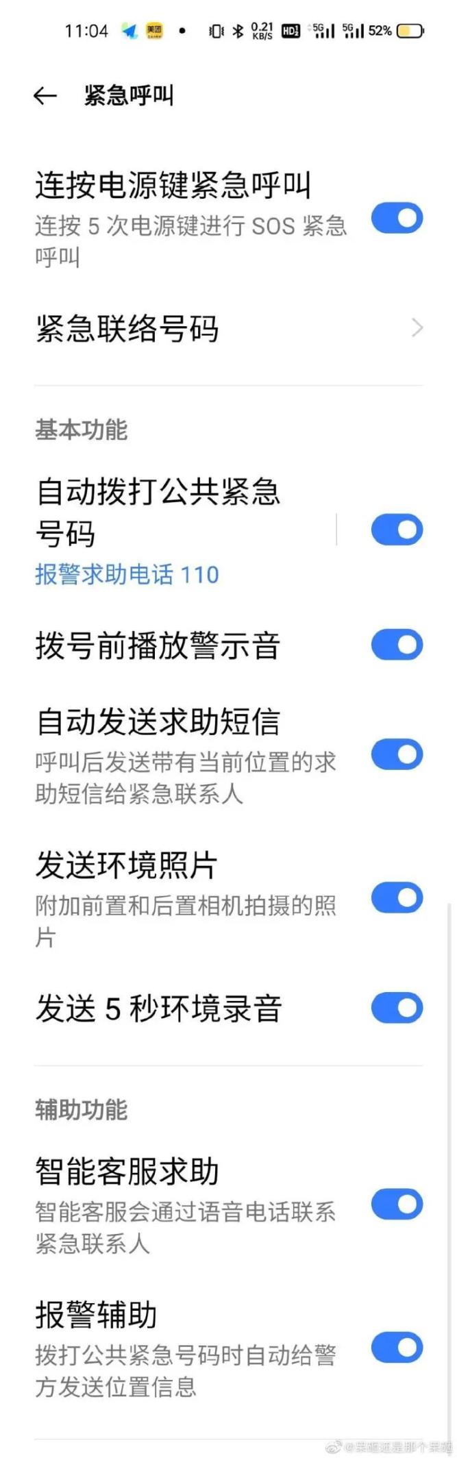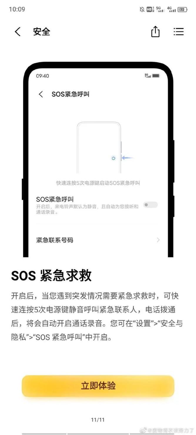 开启后可通过连续按5次电源键触发紧急联系