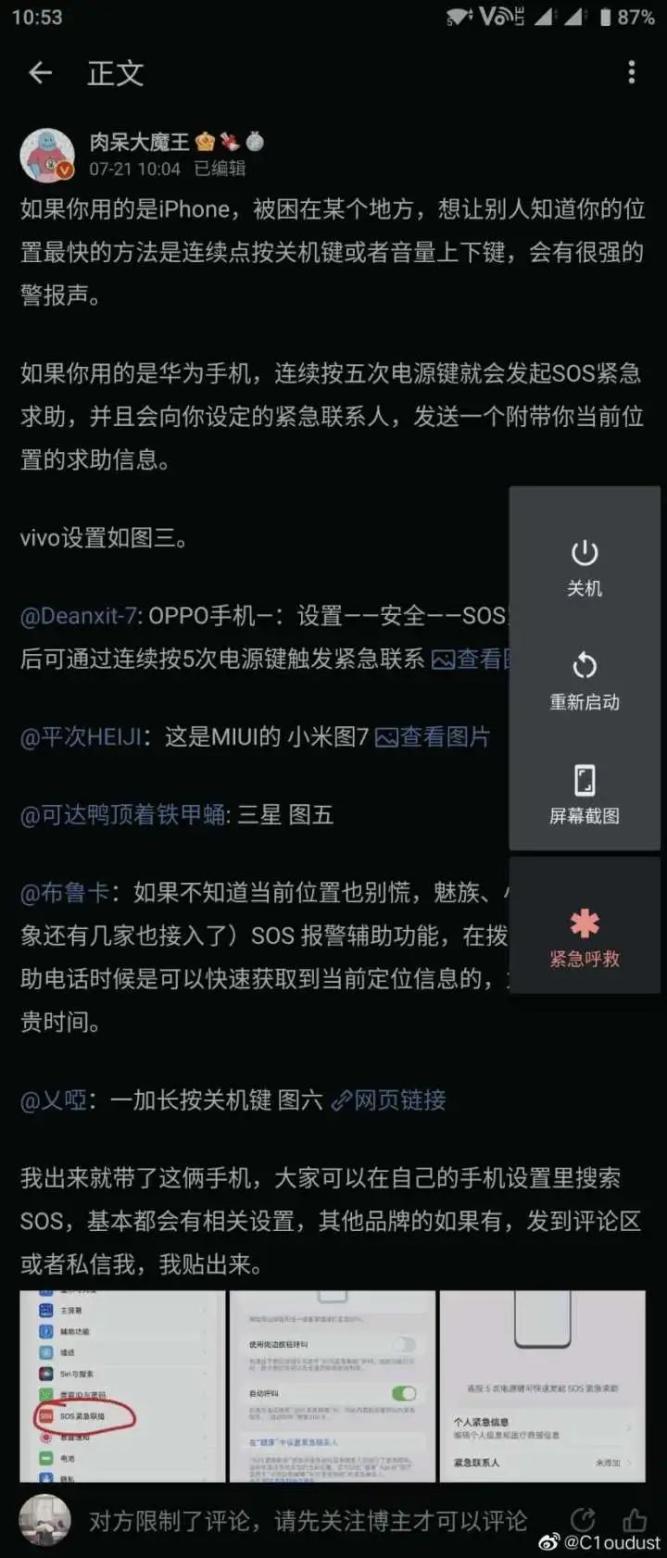 近日,微博博主“肉呆大魔王”更新了一则微博,给大家科普了一则如何使用手机紧急求助按钮的博文,给家里的老人,或者拿着手机的孩子设置一个,最起码多了一个信息源。