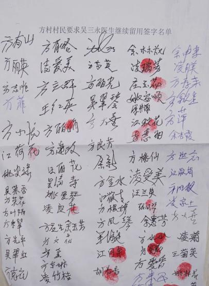 在方村的700多个日日夜夜,吴三永被村民的质朴深情所感动,村民也同样对吴三永的用心医治深怀感激,他们用近200个签名和红手印来挽留这个走村串户的“吴医生”,表达心中的深情。医生,这个职业从来都不是只凭技艺定乾坤,它是一个良心活,只有懂得敬畏生命,才对得起病人的托付。一双温暖的手,一颗仁慈的心,身为医者,看的是病,救的是心,开的是药,给的是情。