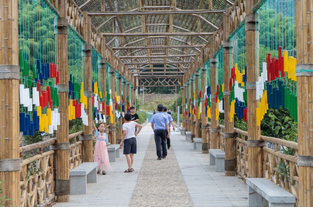 行走在葛家村,记者感觉仿佛置身一个艺术创意天地。充满艺术感的小景点、小设计,令人目不暇接,一步一景、移步换景、处处皆景。村里的老桂花树下,用石头和毛竹垒砌的“人”字形座椅,既可以坐,也能倚靠躺卧,村民们聚在一起乘凉聊天,好不惬意;老屋的长藤上,挂着竹筒做的五彩风铃,发黄的墙壁上,寥寥几笔勾出远山,任谁经过都要回头仔细瞧一瞧;再过一个转角,又遇到用石头、盆景等打造的枯山石景,颇有韵味;就连原本路上碍眼的电线杆,也被形状不同、颜色各异的小木板包裹起来,成了迷你花坛,化身街头艺术的一部分……