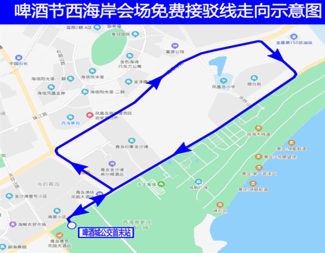 ➥为方便市民游客经隧道线路至金沙滩啤酒城,或从烟台前社区和金沙滩其它社会停车场至金沙滩啤酒城的出行需求,青岛西海岸新区在啤酒节期间临时开通一条啤酒节接驳线(单向环线运行),由啤酒城公交首末站发车经金沙滩路、嘉陵江东路、漓江路、云雾山路、金沙滩路到达啤酒城公交首末站。
