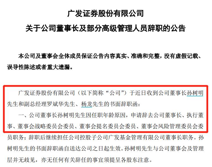 7月22日盘后,广发证券公告称,董事长孙树明因任职年龄原因,申请辞去公司董事长等职务,继续担任公司控股子公司广发基金董事长职务。