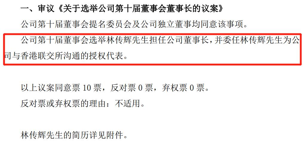 随后再次公告,董事会选举林传辉担任公司董事长。